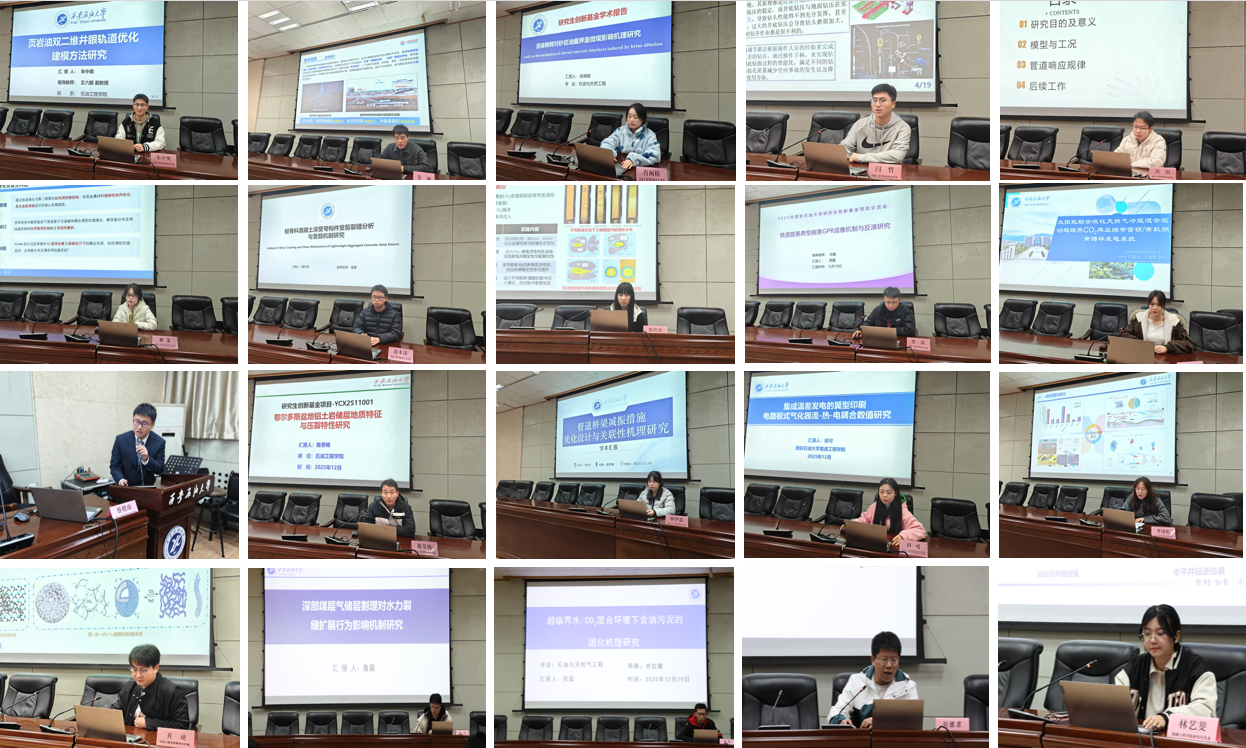 按照学校研究生工作部关于2025年研究生学风建设暨学术文化活动月的安排部署,12月19日,由研究生工作部主办,石油工程学院、机械工程学院、管道工程学院三个学院组织承办主题为“研途论道促提升 学科交融启新篇”研究生学术报告会,共100余名研究生代表参与报告会,报告会由研究生辅导员宋兴淼主持,各学院研究生代表围绕学科前沿动态、科研实践成果、技术创新应用等内容展开深入交流,共同奏响了一曲学科交融、研思并进的青春乐章。
