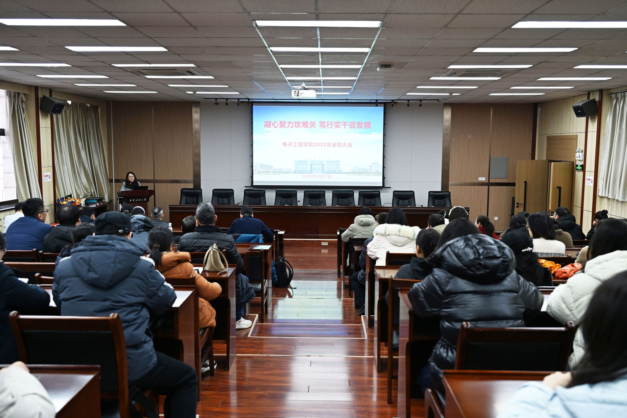 12月31日下午,电子工程学院在雁塔校区第五会议室隆重召开2025年度学院大会。会议以“凝心聚力攻难关,笃行实干促发展”为主题,全面回顾过去一年的工作成果,展望未来发展蓝图。学院党委书记潘娜主持会议。