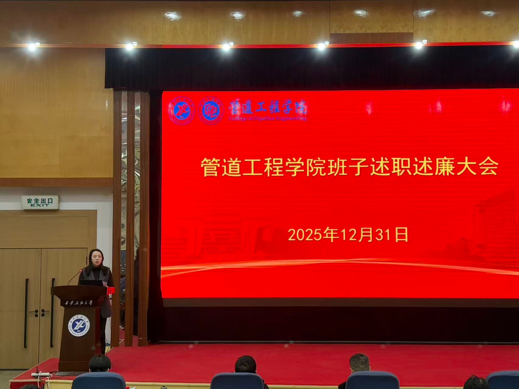 2025年12月31日,管道工程学院在雁塔校区学术报告厅召开2025年度中层领导班子和处级干部述职述廉大会,会议由学院党委书记贾莉娜主持,学院全体教职工参会。