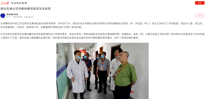 为保障学校科研工作及研究生复课后的实验教学秩序,6月3日下午,beat365官方网站副校长陈军斌带队对学校雁塔校区各院(系)实验室(中心)安全工作进行了专项检查。党政办公室、保卫处、实验室管理处、科技处、国有资产处、后勤管理处等相关部门负责人参加检查。