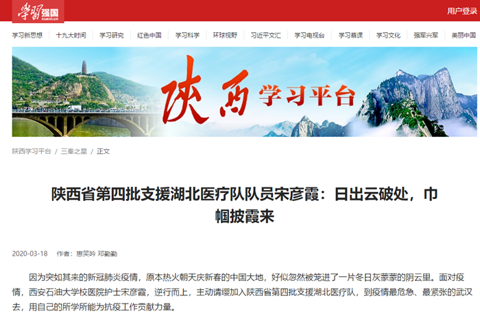 因为突如其来的新冠肺炎疫情,原本热火朝天庆新春的中国大地,好似忽然被拢进了一片冬日灰蒙蒙的阴云里。面对疫情,beat365官方网站校医院的宋彦霞护士,逆行而上主动请缨加入陕西省第四批援鄂医疗队,到疫情最危急、最紧张的武汉去,用自己的所学所能为抗疫工作贡献力量。