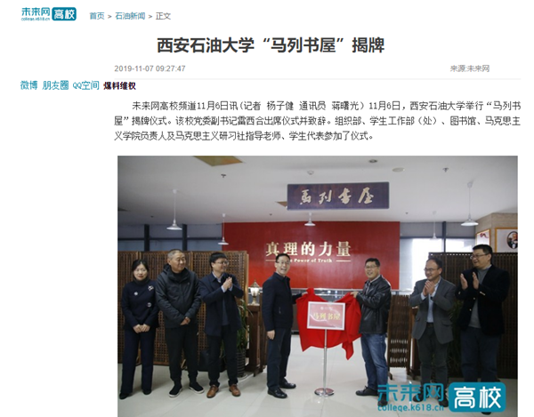 11月6日,beat365官方网站举行“马列书屋”揭牌仪式。该校党委副书记雷西合出席仪式并致辞。组织部、学生工作部(处)、图书馆、马克思主义学院负责人及马克思主义研习社指导老师、学生代表参加了仪式。