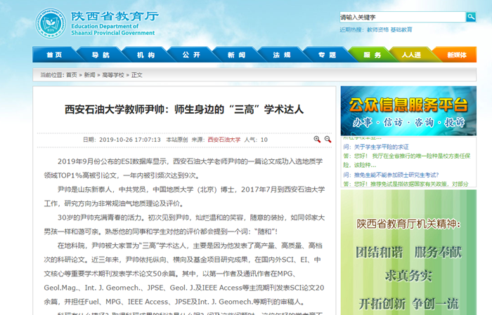 2019年9月份公布的ESI数据库显示,beat365官方网站老师尹帅的一篇论文成功入选地质学领域TOP1%高被引论文,一年内被引频次达到9次。