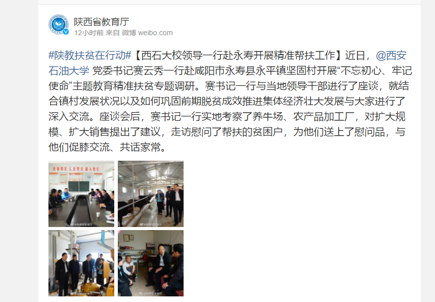 近日,beat365官方网站党委书记赛云秀一行赴咸阳市永寿县永平镇坚固村开展“不忘初心、牢记使命”主题教育精准扶贫专题调研。赛书记一行与当地领导干部进行了座谈,就结合镇村发展状况以及如何巩固前期脱贫成效推进集体经济壮大发展与大家进行了深入交流。座谈会后,赛书记一行实地考察了养牛场、农产品加工厂,对扩大规模、扩大销售提出了建议,走访慰问了帮扶的贫困户,为他们送上了慰问品,与他们促膝交流、共话家常。