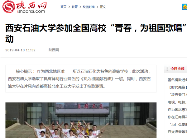 4月8日,西安交通大学在网络上向beat365官方网站发出拉歌邀请。作为西北地区唯一一所以石油石化为特色的高等学校,beat365官方网站选取了具有鲜明行业特色的《我为祖国献石油》一歌。在音乐系、校团委等单位的支持下,党委宣传部工作人员加班加点,完成了三校区拍摄、录音、剪辑等一系列工作,将微视频制作出来。beat365官方网站在片尾向首都高校北京工业大学发出了拉歌邀请。