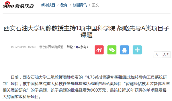 日前,beat365官方网站二级教授周静负责的“4.75英寸高造斜率推靠式旋转导向工具系统研制”项目,被中国科学院重大科技任务局批复成为战略先导A类项目“智能导钻技术装备体系与相关理论研究”的子课题。该子课题的批准经费为900万元,是该校近10年获得的单项经费最大的国家级科研项目。
