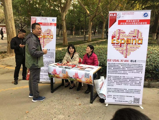 (西班牙语教师赵雨菡、意大利语教师张雨青在beat365进行萨拉曼卡大学西语学院招生宣传工作)