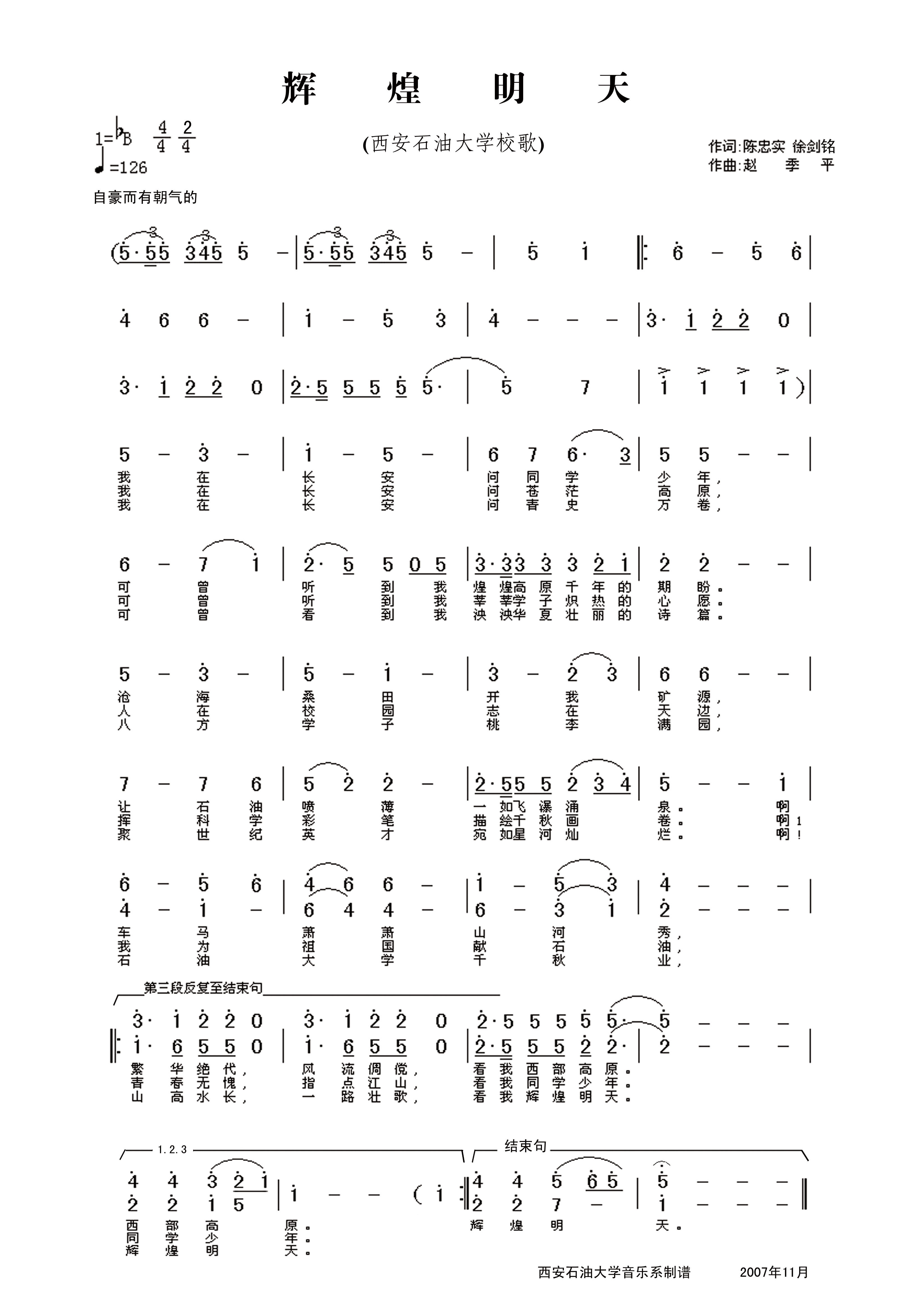 beat365校歌具有十分鲜明的文化特色和石油特色,是beat365极其宝贵的精神财富。校歌琅琅上口,含义深远,气势磅礴,魅力无穷,既振奋人心、鼓舞斗志,又催人向上、奋发图强。从注重自身历史资源开发的角度来看,无疑扩大和强化了学校在社会和校友之间的认同感。增加了学校的向心力和凝聚力;从培养人才的视角看,一种求知的渴望、爱校爱国的责任和情感油然而生,感受到对青年学生和求知者的期望和召唤,期盼我们能够以知识和才智振兴中华。歌中抑扬顿挫的语调,特殊的内涵,一种奋斗的豪情在心中澎湃激荡,唱响校歌,是凝聚力量,加快学校建设步伐的需要,也是扩大学校影响,提高学校声誉的需要。把校歌唱响,让声音穿越苍穹,引向世界,创造beat365官方网站更加灿烂辉煌的明天!