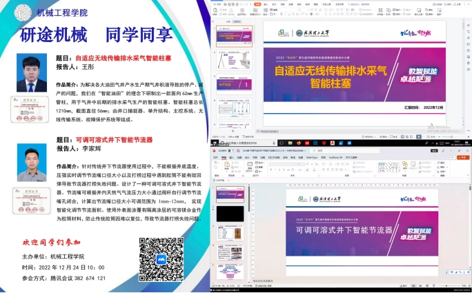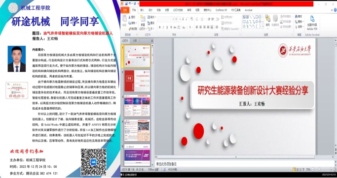 2022年12月24日“车谷杯”第九届中国研究生能源装备创新设计大赛获奖者王彤、李家辉和王欢畅分别分享了自己的设计成果、经验与心得,会后就同学们提出的问题做出解答,为同学们下一步参赛作参考。
