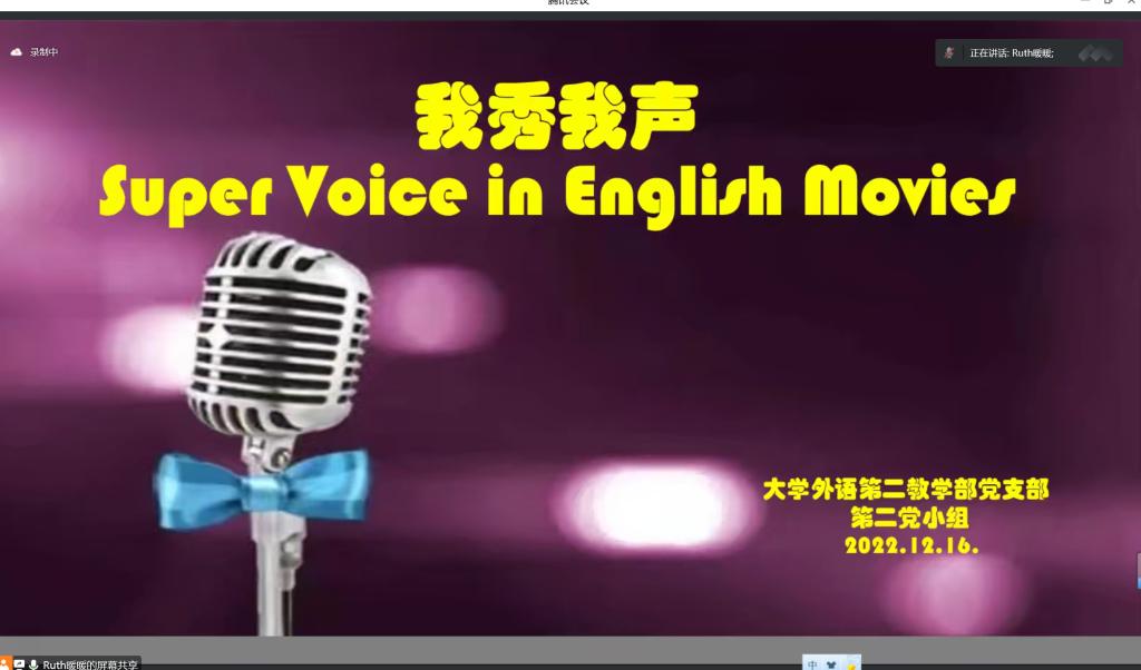 为提升大学生英语口语水平,丰富校园文化生活,由外国语学院大学外语第二教学部党支部主办,支部第二党小组承办的英语新起点加油站线上系列活动(第二期)“我秀我声——2022级英语电影配音大赛”于2022年12月16日晚7:30通过腾讯会议平台如期举行。外国语学院副院长陈武,大学外语第二教学部党支部书记李红,大学外语第二教学部副主任武绒,支部党员教师及部分2022级同学出席并观看了此次配音大赛。