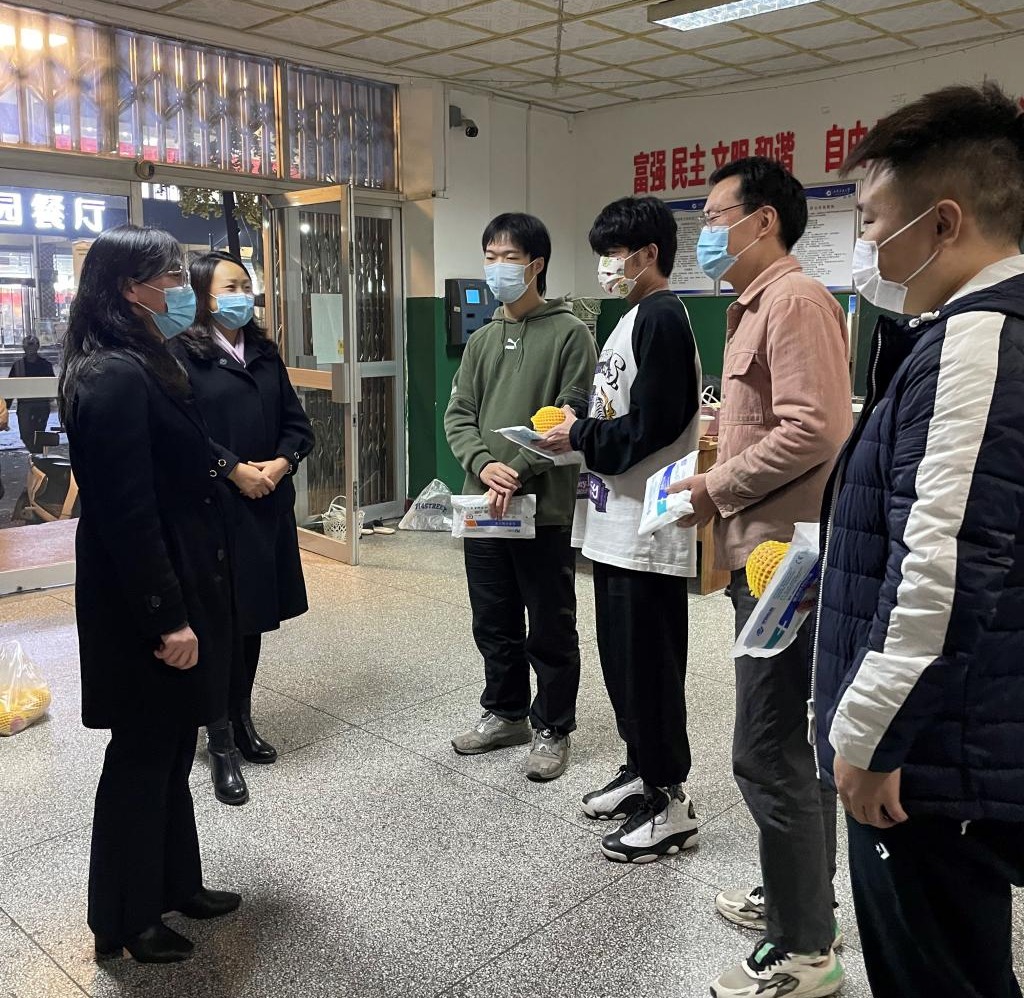 11月27日晚,院党委书记田虹霞、副院长刘辉一行,深入雁塔校区学生公寓看望慰问在校研究生,了解学生面临的实际困难,并为学生送去医用口罩、苹果等慰问品。研2021级辅导员陶李陪同走访。