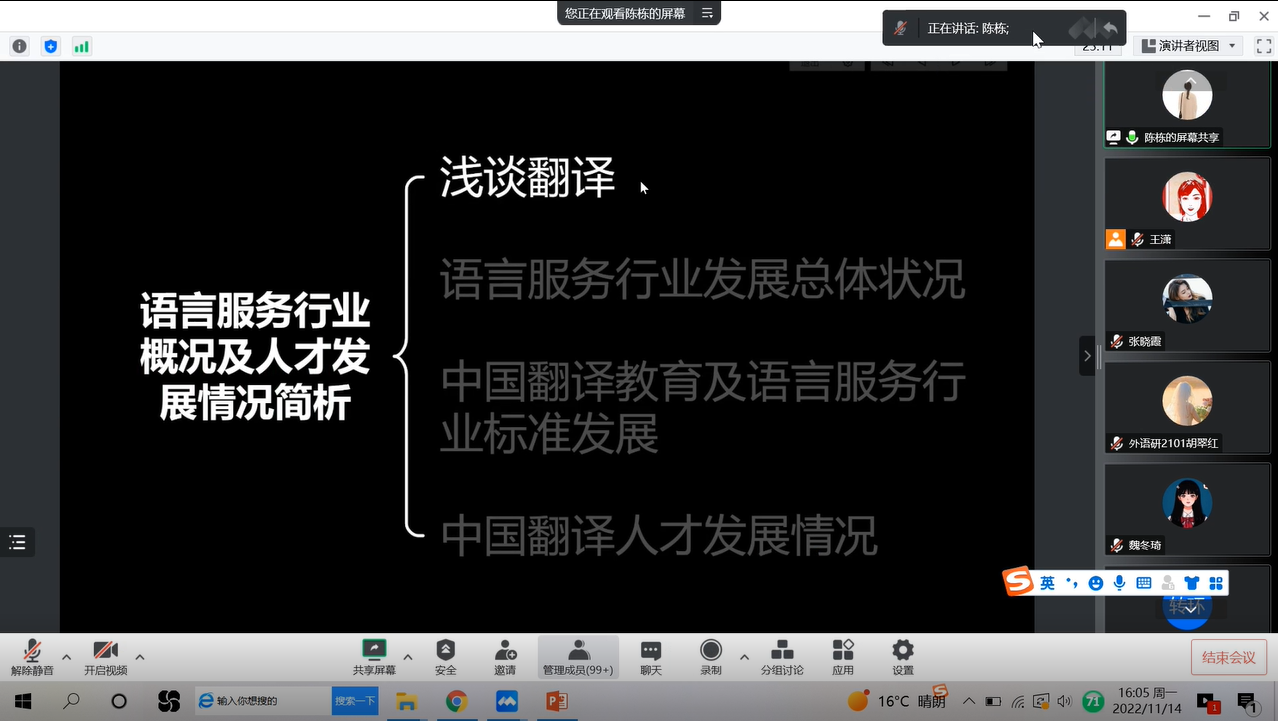 为进一步做好2023届毕业生就业创业工作,加强学生就业指导,强化就业育人实效,提高翻译硕士研究生的职业素养,帮助学生了解语言服务行业的基本现状,引导学生从实际出发选择职业和岗位,做好职业规划。11月14日下午,外国语学院邀请中译语通(陕西)科技有限公司语言服务事业群陈栋副总监,为beat365MTI全体研究生作题为“语言服务行业及其发展概况”的线上专题讲座。外国语学院MTI全体研究生100余人参加讲座,讲座由副院长刘辉主持。