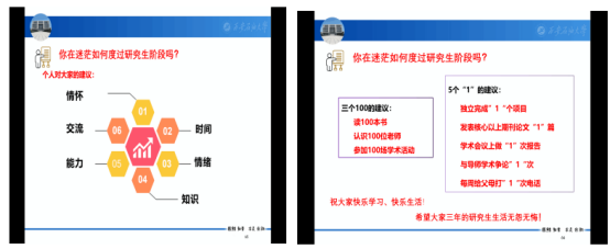 为了帮助研究生尽快适应研究生学习生活,他结合自身指导研究生的经验,就如何尽快适应研究生学习生活,提出了四个转变:一是思想意识上的转变,由被动学习向主动学习转变;二是学习标准的转变,由仅以学习成绩为标准向掌握知识和熟练应用转变;三是学习方法的转变,由以死记硬背、应付考试向深入理解、学以致用转变;四是学习形式的转变,由注重理论学习向边学边实践、创造性学习转变。