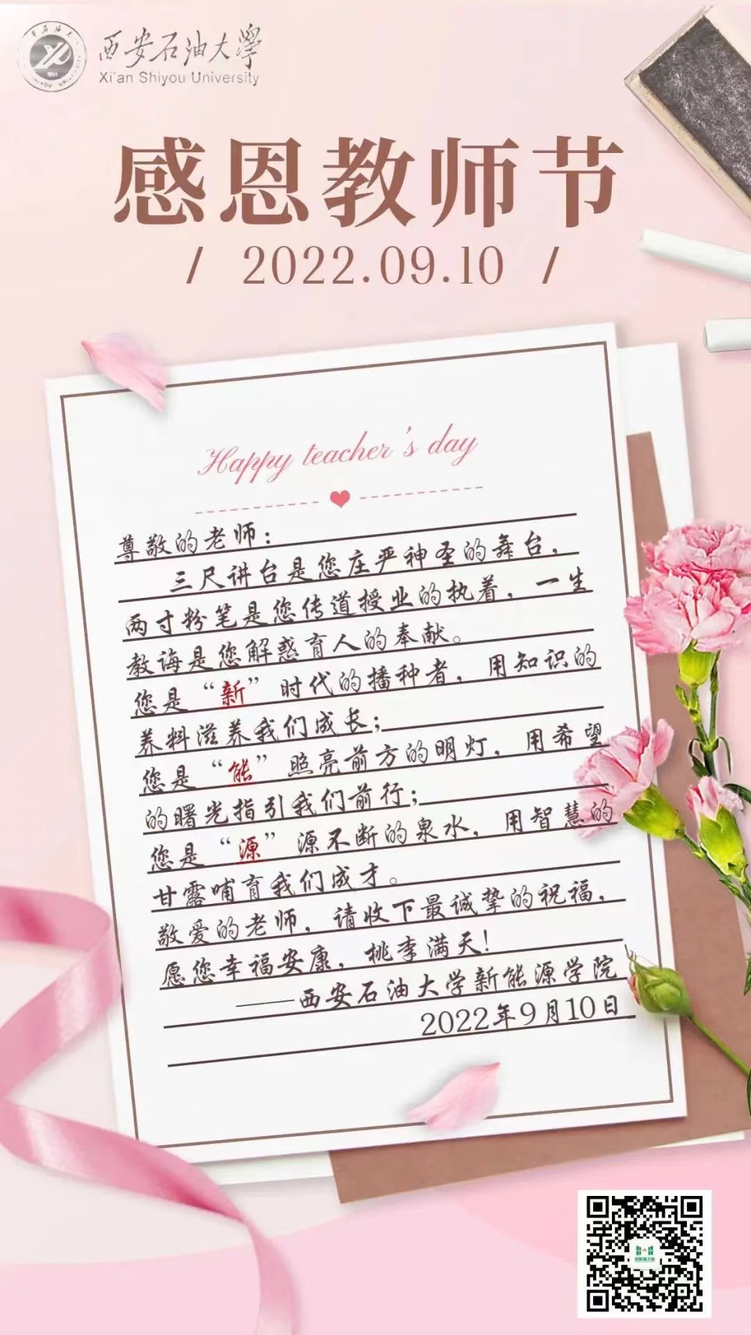 2022年9月10日是我国第38个教师节,也是党的十八大以来第10个教师节。为加强尊师文化建设,强化学生感恩意识,9月8日-10 日,新能源学院开展“迎接党的二十大,感怀师恩扬师德” 学生感念师恩系列活动,活动紧扣主题、丰富多彩、形式多样,采用线上与线下相结合的方式进行,节日气氛浓郁,让每位教师都感受到了新能源学子对恩师的敬爱之情。