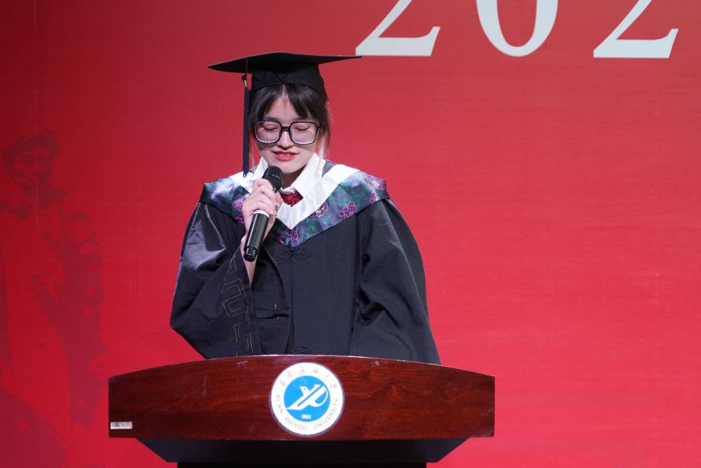 2022届毕业生代表潘菻颍同学代表学院全体本科生发言。首先,她代表学院全体本科毕业生们向多年来给予辛勤教诲的各位老师致以衷心的感谢和崇高的敬意。随后,她回首四年求学时光珍贵瞬间,从军训、文艺晚会、竞赛活动到一场难忘的考试,那些与老师们、同学们相处的点点滴滴将是温暖未来岁月的宝贵财富。最后,她表示,作为一名新时代的青年,将永远不忘母校的辛勤栽培,要以实现中华民族伟大复兴为己任,增强做中国人的志气、骨气、底气,不负时代,不负韶华,不负党和人民的殷切期望。