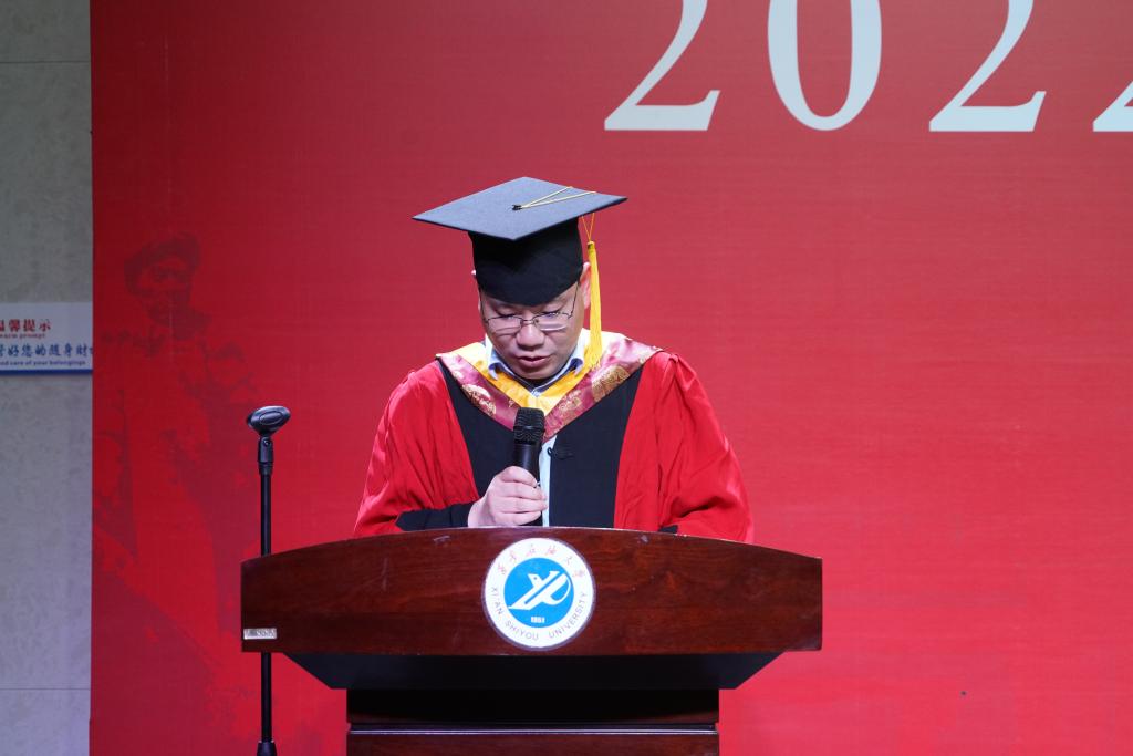 教师代表郭文阁教授结合自身的教学经历,与同学一同回顾四年时光的匆匆而过,展望未来之路的不凡征途。他向同学们热情嘱托,希望大家心怀理想、永不言弃、敢于追梦、守住初心,在新时代创造新业绩,祝愿同学们阅尽千帆,归来仍是少年。