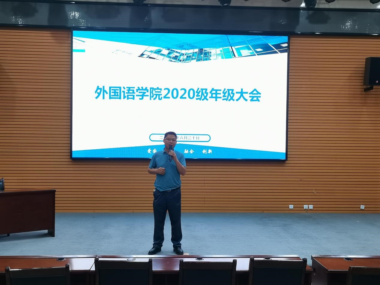 6月20日,外国语学院在崇文楼118召开2020级年级大会,学院党委副书记王业青到场指导大会,年级大会由2020级辅导员陈浩老师主持,2020级全体学生参加。