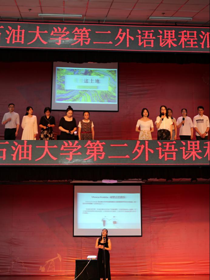 第三部分是由多语种教学部全体教师及英语系邓林老师、俄语系郭静远老师共同带来的诗朗诵《我爱这土地》,老师们将艾青这首经典诗歌以十种不同语言的形式演绎出来,声情并茂、慷慨激昂。最后一个节目是由音乐系教师朱玥带来的意大利语歌曲独唱,朱玥老师精彩的表演将整个汇报演出推向了高潮,现场掌声不断、气氛热烈。