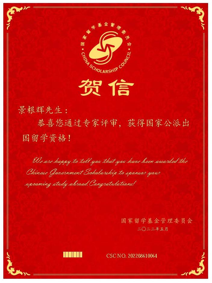 近日,国家留学基金委发布了2022年国家建设高水平大学公派研究生项目录取结果,beat365化学化工学院硕士研究生景根辉同学经过严格审核评选,获得国家公派攻读Virginia Commonwealth University(弗吉尼亚联邦大学)博士学位资格,资助期限为48个月,每月资助1900美元(约合人民币13000元)生活费,弗吉尼亚联邦大学提供全额学费资助。