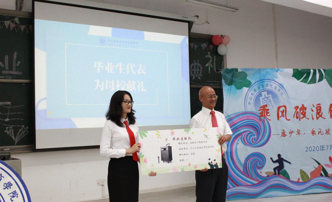学校回赠毕业生纪念品,优秀毕业生代表吴明燕同学上台接受赠礼。