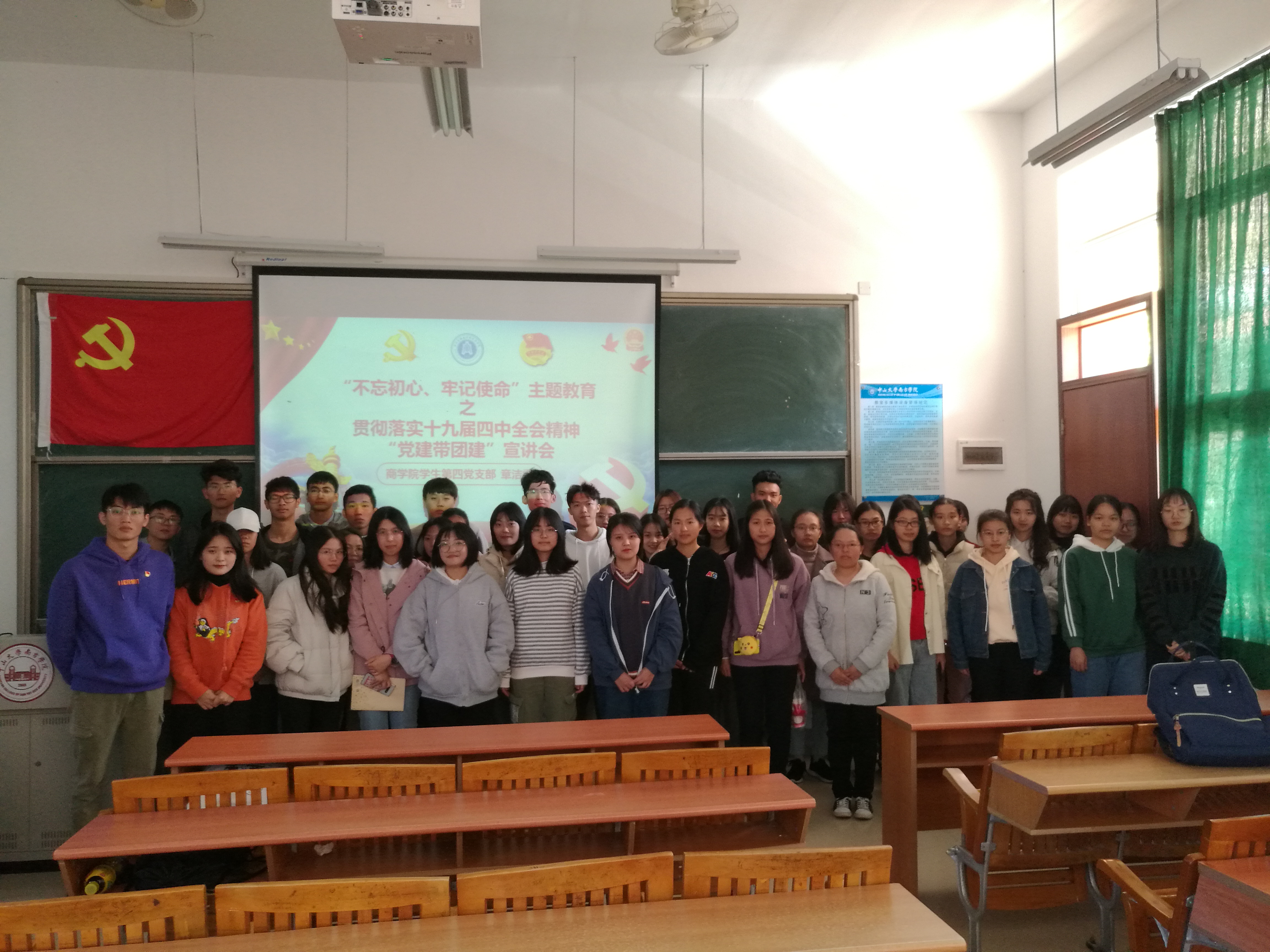 十九届四中全会会议成果作为彰显制度优势的中国方案、推动国家发展的力量之源、提升治理能力的行动指南,为贯彻其精神意涵与深入开展“党建带团建”工作。2019年12月4日中午13时,77779193永利官网学生第四党支部于8教205面向2018级、2019级部分优秀团员开展贯彻落实十九届四中全会精神“党建带团建”宣讲会,由77779193永利官网学生第四党支部学生党员章洁雯担任本次会议主讲人。宣讲会共三个部分,第一个部分为“十九届四中全会精神引领下的“党建带团建”工作,第二个部分为“党建带团建工作成果展示”,最后一个部分为“十九届四中全会内容知识问答及总结”。